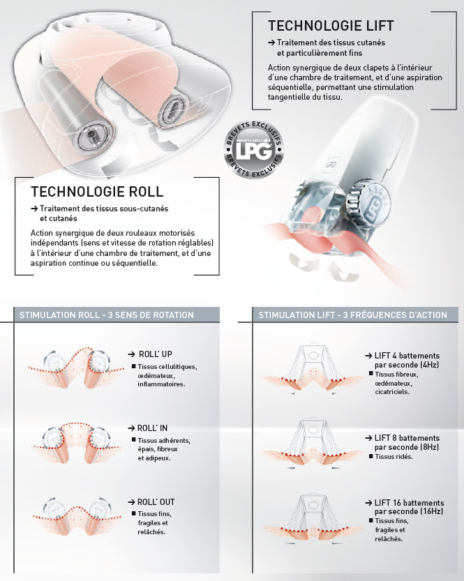 STIMULATION TISSULAIRE ET CELLULAIREL’endermologie® est la science conjonctive mise au point par lpg permettant une double stimulation tissulaire (par mécanisation) et cellulaire par mécanotransduction). La mobilisation mécanique produite par les têtes de traitement LPG provoque une réactivation du métabolisme tout en préservant l’intégrité des tissus.LPG propose deux technologies uniques et brevetées de mobilisation tissulaire, que la main ni aucun autre dispositif ne peut reproduire.