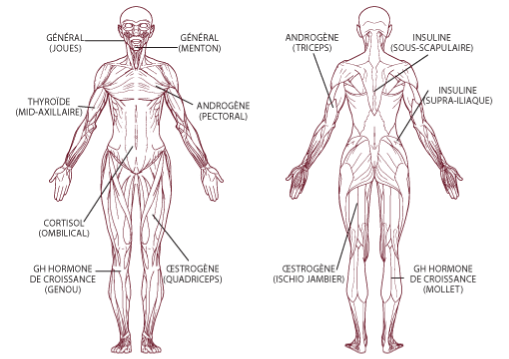 Les 12 plis cutanés mesurés et leur hormone correspondante.